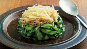 パリパリした歯ざわりのきゅうりに、ほぐしたツナ、しょうがをたくさんのせたケーキみたいなサラダ。甘酢でさっぱりといただきます。