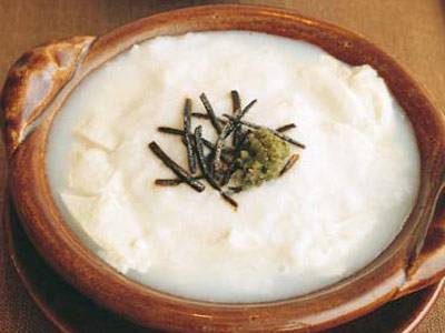 「ゆ」と呼ばれる汁にフワフワと豆腐が浮いたおぼろ豆腐です。材料は、大豆、水、にがりの3つだけ!手づくりした人だけが出会えるおいしさです。