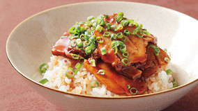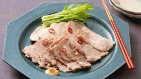「焼酎マリネ豚」を甘じょうゆだれに漬け込んで、チャーシュー風に。ゆで汁の梅干しも加えて、さっぱり、爽やか!