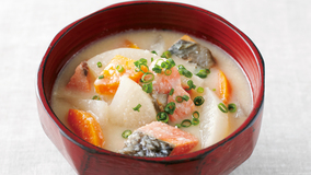 酒かすのやさしい風味が塩ざけによく合います。具材それぞれの持ち味が重なって、味わい深い一椀(わん)に。体が芯から温まります。