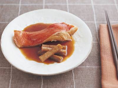 きんめだいの頭と大根を、薄めのたれでじっくりと煮ます。骨についた身を残さず、うまみを楽しみます。