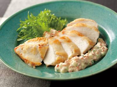 むね肉をフライパンで蒸しゆでにし、風味のよいねぎソースをたっぷりかけます。しっとり仕上げるコツは“冷まし方”にあり!