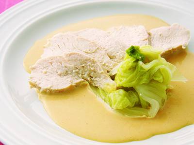 レンジで酒蒸しにした鶏むね肉に、「キャベツのザク切り蒸し」をたっぷり添えます。さんしょうがきいたピリ辛味のたれをかけて。