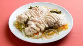 胸肉はパサパサしがちですが、蒸しゆでにすることでしっとり仕上がります。コクのあるソースをかけてどうぞ!