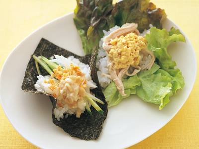 3種の具をはさんだ、彩りよくふんわり軽やかなサンドイッチ。にんじんときゅうりは、口当たりの邪魔をしないようごく薄くスライスするのがポイントです!