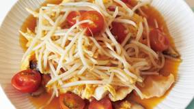 具だくさんの卵焼きに、もやしたっぷりのあんをかけてボリューム満点!おかずにしても、ご飯にのせて天津飯風にして食べてもおいしい。