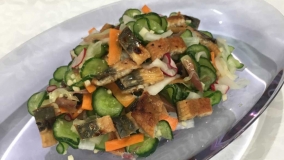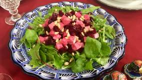 色とりどりの具材をコロコロに切ってきれいに並べ、混ぜて食べる具だくさんのサラダです。ゆで卵やアボカド、レタスなど好みの具材を加えてもよいでしょう。