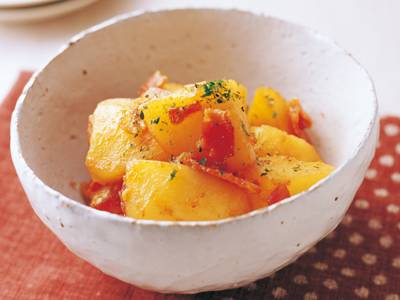 甘辛く味つけしたじゃがいもの料理に、カリカリに焼いたベーコンのコクとうまみを足した、新しいレシピです。