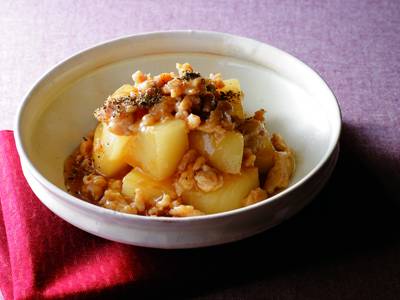 甘みの増した冬の大根をじっくりと揚げ焼きにして油を含ませ、鶏ひき肉と炊き合わせました。