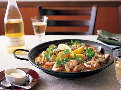 家庭でつくれる本格的なパエリャ。最初にスープをつくって、そのうまみをしっかりお米に吸収させるのがコツです。
