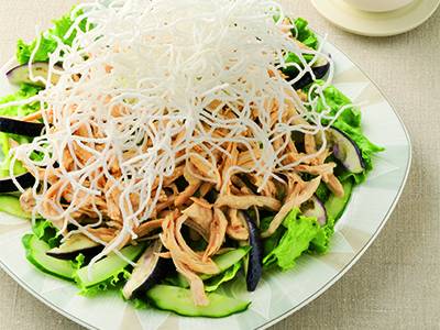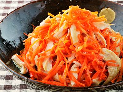 パサつきやすい鶏むね肉も、電子レンジで蒸してマリネすると、しっとりした口当たりに。鶏肉のうまみたっぷりの蒸し汁をマリネ液に混ぜるのがポイントです。揚げた春雨をのせると、コクがついて華やかになります。