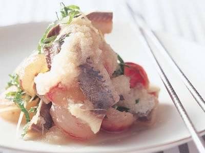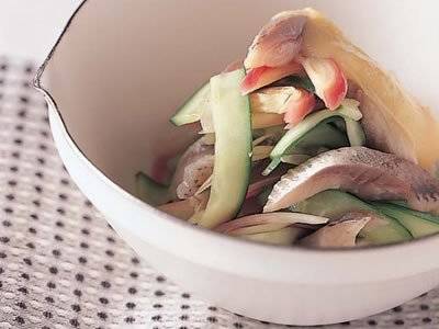 いわしの酢漬けを使ったあえ物。梨とぶどうの甘みが酸味をマイルドにします。