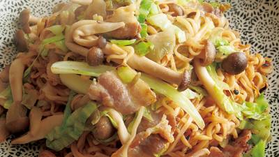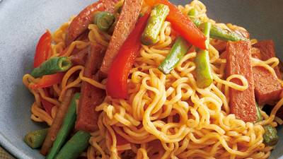 即席ラーメンは、ゆで時間も短く保存期間も長いので買い置きにピッタリ。ピリ辛あえ麺を、家庭でもつくりやすくアレンジしました。