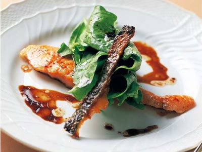 バターのかわりに、にんにくと赤とうがらしで香りづけをした特製オイルで香ばしく焼いたヘルシーなムニエル!まろやかな酸味のバルサミコソースが食欲をそそります。