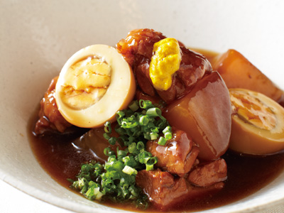 おからといっしょにゆでて脂を吸わせることで、コクを残しつつさっぱりと仕上げた豚角煮です。