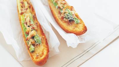 フランス式のオープンサンド「タルティーヌ」をピザ風にカリッと焼き上げます。