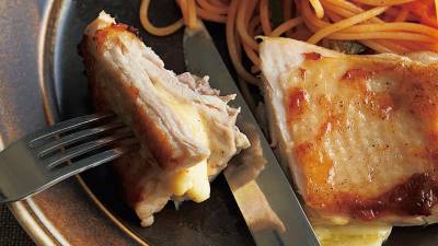 豚カツ用の厚めの豚肉を使い、満足感をアップ。特製甘辛だれをしっかりもみ込んで、キムチと煮込みます。