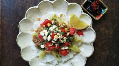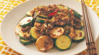 ズッキーニとエリンギは、オイスターソースを練り込んだひき肉とよくからむので、野菜もしっかり食べられます。