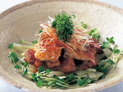 ダイエット中でも揚げ物が食べたいときは、上質の油を使って短時間で揚げれば安心。付け合せの野菜もたっぷり添えて。