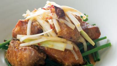 香ばしく焼き上げた鶏肉に、たっぷりの香味野菜を添えて。エスニック風のたれも、食欲を刺激します。