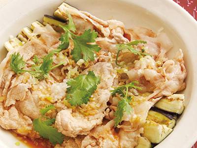 なすに豚肉を重ねて蒸し、豚肉のうまみをなすにしみ込ませます。香味野菜を散らして風味豊かに!