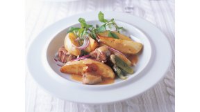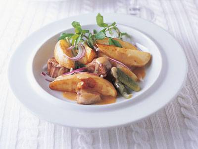 じゃがいもを使ったフランス風のおそうざい。豚肉のゆで汁を使ったソースでいただきます。