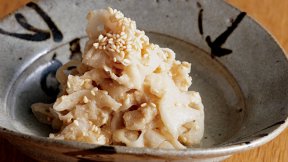 ほんのり、でんぷんの甘みをもつれんこんには、酸味のあるあえ衣がよく合います。少量のオリーブ油で香りも軽めに、上品に。