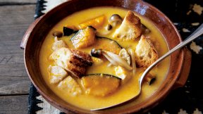 堅くなったパンをおいしく食べるためのイタリア伝統のスープにヒントを得て、一皿で満足の具だくさんスープに仕上げました。