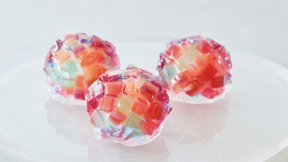 和菓子では、寒天に甘みをつけたものを錦玉(きんぎょく)かんと呼びます。色づけをして白あんをくるめば、あじさいのでき上がり。キラキラと光を通す姿が美しい!