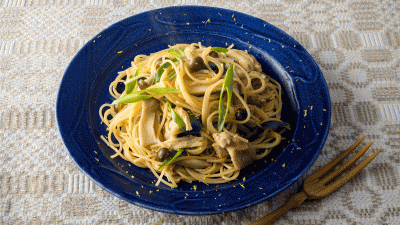 ジェノベーゼ?いえいえ、青じそを使ったしそ・ベーゼです!ジェノベーゼよりもさっぱり食べられ、仕上げの青じその香りとスナップえんどうの食感が季節感を際立たせています。