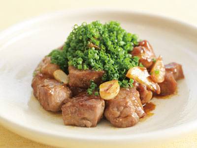 豚肉とにんにくを組み合わせた、疲れも吹き飛ぶガツンとした炒め物。細ねぎをどっさりのせてさっぱりと。