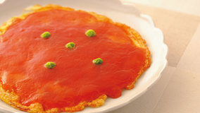 チリソースはえび以外とも相性よしです。「かにかま」を使ったフワフワ卵にチリソースをトロリと。