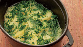 厚手の鍋でじゃがいも・たまねぎ・にんじんを蒸し煮に。豚バラとたっぷりのハーブをのせて仕上げます。