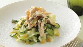田代さんの懐かしの味を洋風にアレンジ。春キャベツときゅうり、青じそを塩でもんだシンプルなサラダにささ身を加えてボリュームアップ。ドレッシングのマーマレードジャムがアクセント。
