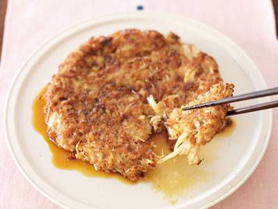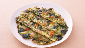 みつばとアスパラガスの香りがいい春のチヂミです。表面をカリッと焼くのがポイント!