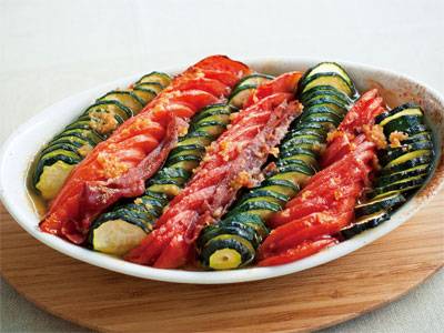 トマトやズッキーニから出た水分は、どんなソースにも負けないほどのおいしさです。生ハムの塩けがアクセントに!