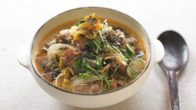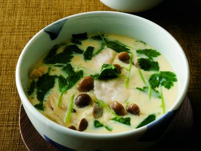 大きな器に、たっぷりの具を入れたボリューミーな茶碗蒸し。水を注いだ鍋に器を置いて火にかける“地獄蒸し”という調理法でつくります。