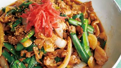 新たまねぎ、豚肉、にんにく、にらでスタミナたっぷり、ご飯がすすむ甘辛味の一品です。