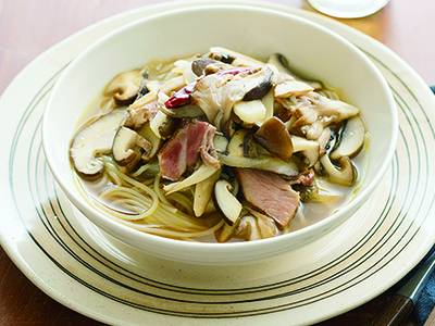 きのこをこんがりと炒めたら、だしを加えてきのこのエキスを煮汁に移すのがおいしさの秘けつ。