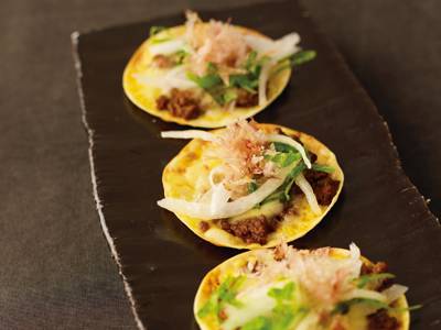 「即席カレー」をアレンジすれば、速攻、酒の肴(さかな)が完成!生地はギョーザの皮を使ってカリッと香ばしく焼き、香味野菜で爽やかさを添えます。