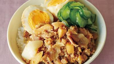 台湾の家庭料理・魯肉飯(ルーローファン)をアレンジ。本来は塊肉を使いますが、薄切り肉を使えば、時短に。冷たいところに肉を加えて煮るので、しっとり柔らかい仕上がりを楽しめます。