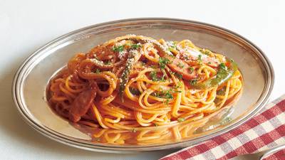 ゆでる時間と手間を省いてしまう「水づけスパゲッティ」で、手打ち麺のようなモチモチ感!ケチャップ味のナポリタンも、ふだんよりワンランク上のできばえになります。