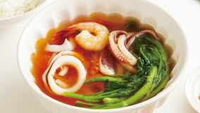 魚介、トマトのうまみに干しえびも加わった、味わい豊かなスープです。クレソンはフレッシュ感を残し、「ごま砂糖塩」をつけておひたし感覚で。