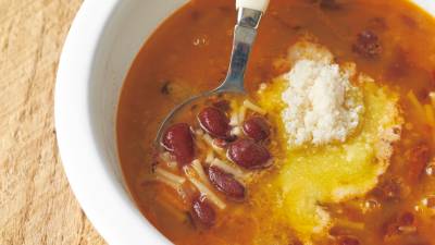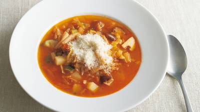 落合流は、炒めるのは具だけ。パルメザンチーズでコクをつけた、甘酸っぱいケチャップソースにパスタをからめます。トロッとした口当たりのナポリタンです。