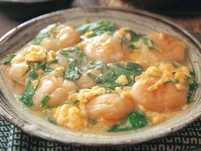 モッチリした柔らかさの卵と麩のやさしい一品。たっぷりの水菜で野菜を補いましょう。