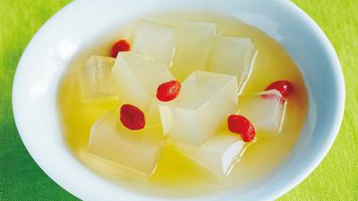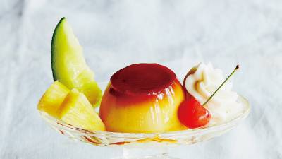 卵や牛乳を使わない、豆乳ベースの冷やしプリン。味も見た目もカスタードプリンそっくりです。卵の色みはかぼちゃで出します。