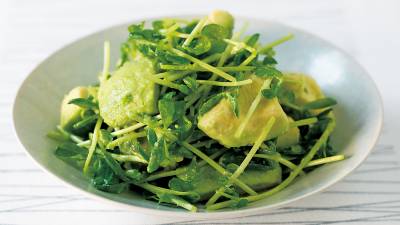 材料を切ってあえるだけの簡単ナムル。アボカドはやや大きめに切り、豆苗のシャキシャキした食感とのコントラストを楽しんで。