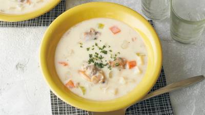 フライパンでできる、生クリームいらずの軽やかなクリーム煮。にんにくで風味をつけて、コク深い味わいに。