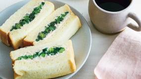 ハムペーストの淡いピンクと、菜の花の濃い緑のコントラストが美しいサンドイッチ。クリーミーでマイルドなペーストとほろ苦い菜の花がよく合います。