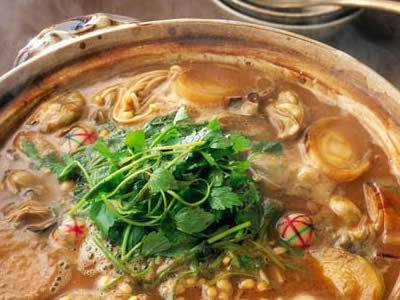 白と赤の合わせみその香ばしさとかきのうまみが相まって、なんともぜいたくなみそなべです。